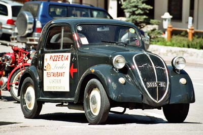gute gastronomische Erfahrungen gesammelt hatten. Der Sinn stand uns nach Pizza und so freuten wir uns um so mehr, als der kleine, am Straßenrand geparkte Fiat Topolino mit der Werbeaufschrift auftauchte.