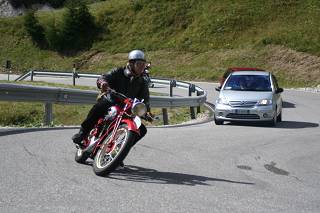 Niedrigdrehzahl, die so ein Nasenkolben - Zweitakter nun mal hat (jeder MZ - Fahrer schaltet in Gedanken 2 mal runter), brummelt sie die Berge hoch und wenn man in den Kurven keine Nerven zeigt, muss man