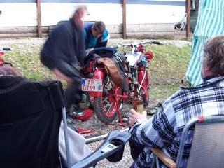 hatte ein Handicap, der Kickstarter funktionierte nicht. War aber kein Problem, da Rennmaschinen sowieso immer angeschoben werden. (Was wäre Falk ohne seine Sprüche...). Ansonsten klappte alles wie beim letzten Mal, nur dass der Bremsgegenhalter diesmal hielt und der Vergaser gleich richtig eingestellt war. Ein wenig gewöhnungsbedürftig ist wohl das Getriebe, aber Panonnia - Treiber können da offensichtlich mehr aushalten als alle anderen.